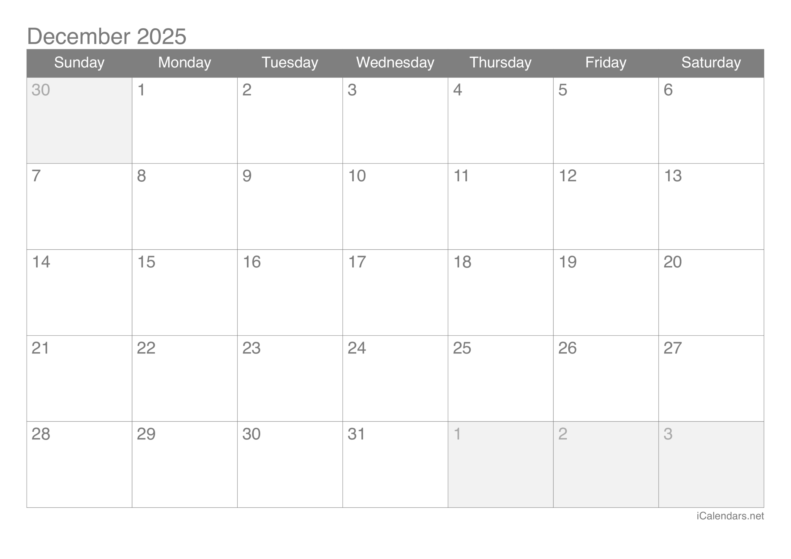 Calendar 2025 December Month Vector Template Download On Pngtree