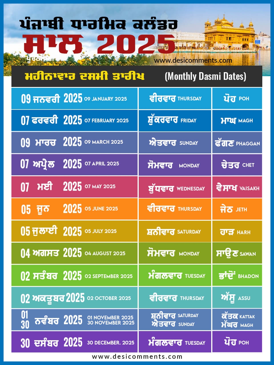 Monthly Dasmi Dates 2025 Calendar Desi Comments