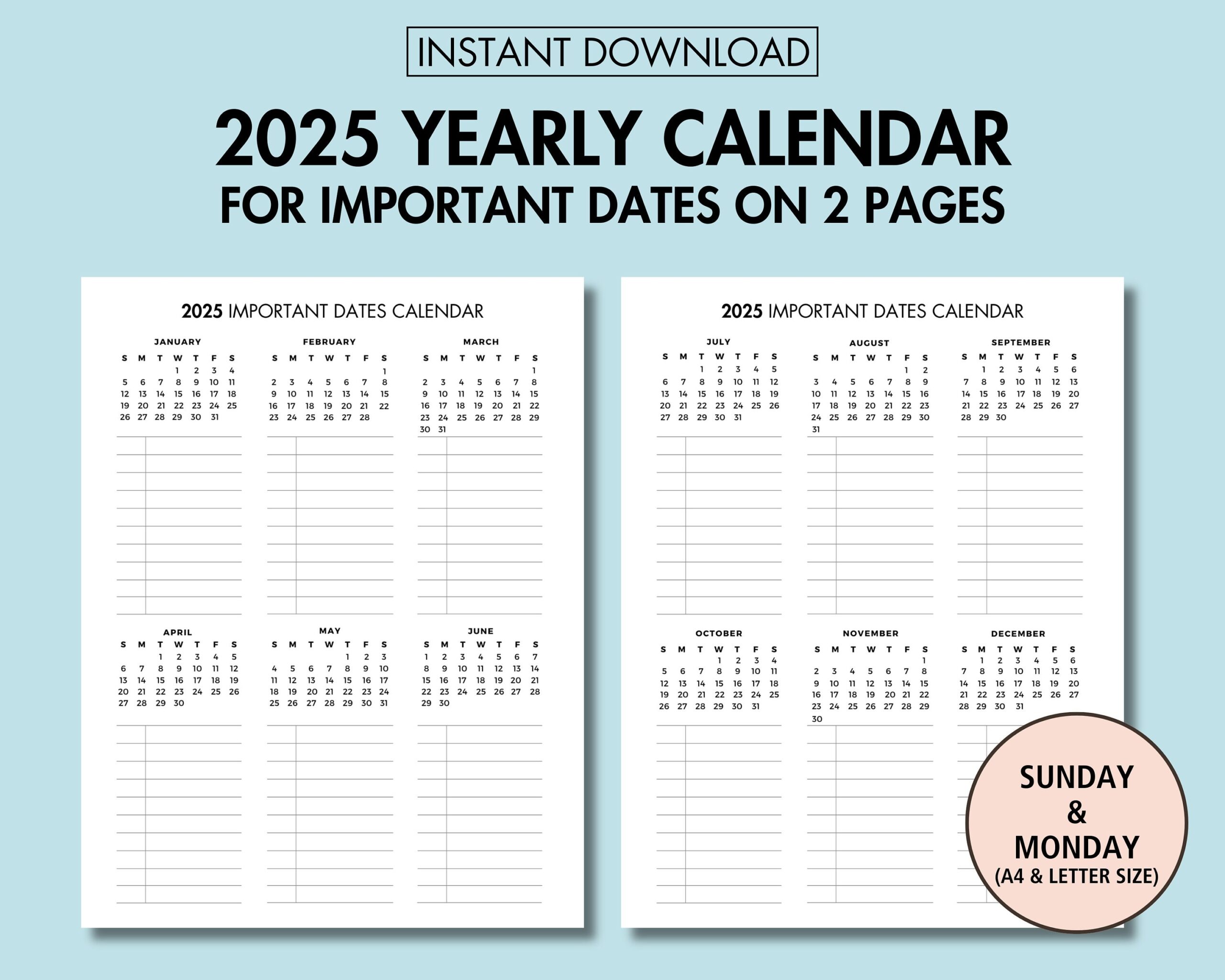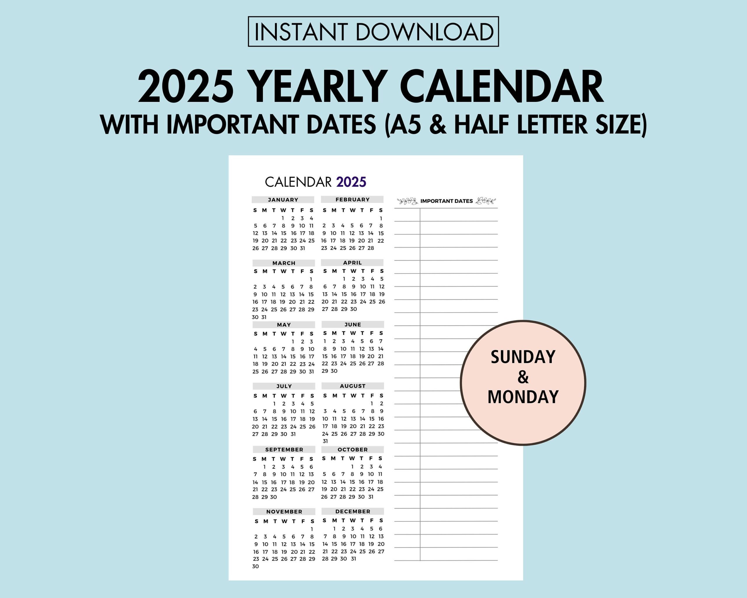 2025 Yearly Calendar For Important Date Printable Yearly Planner 2025 Year At A Glance PDF Yearly Overview Calendar Sunday U0026 Monday Start Etsy