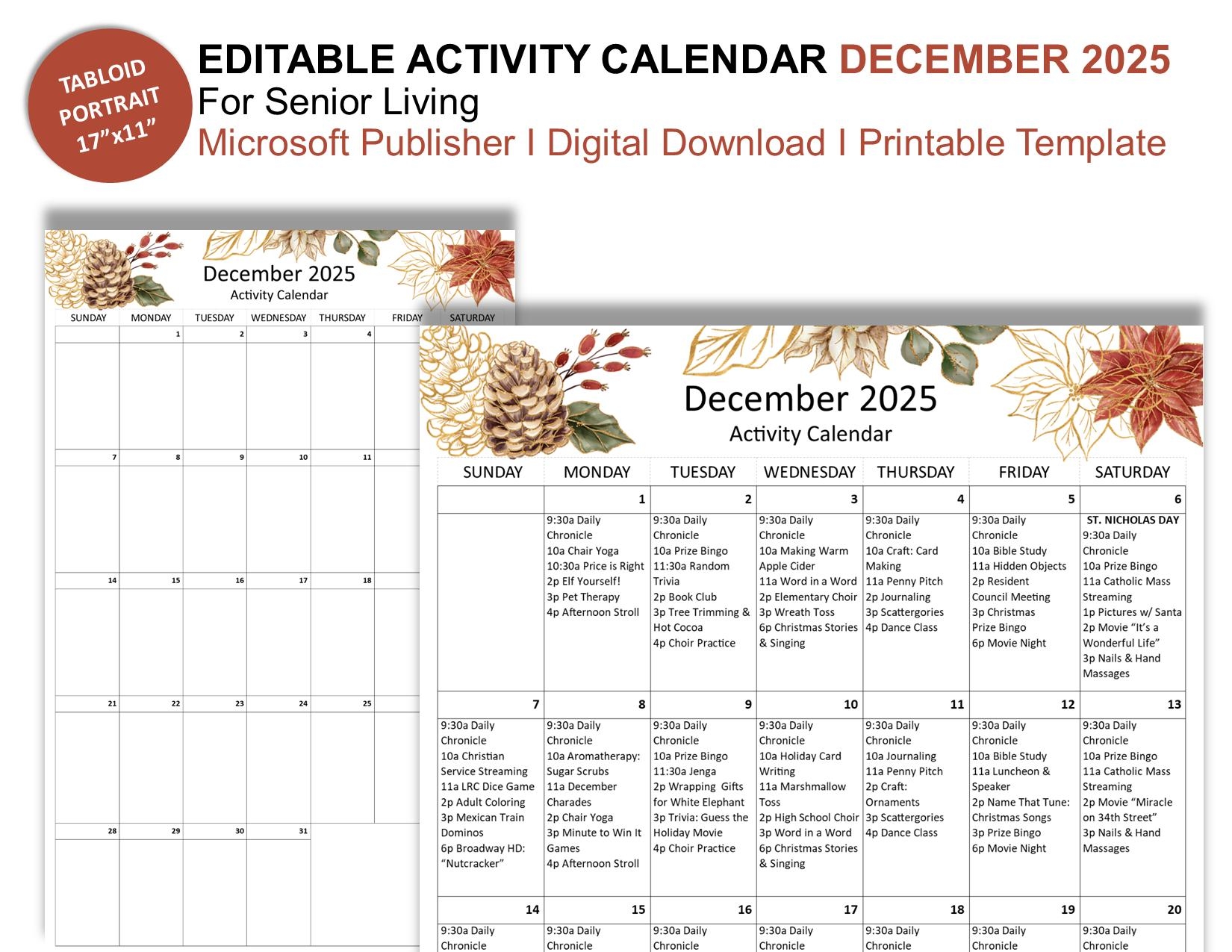 December 2025 Editable Monthly Activities Calendar For Senior