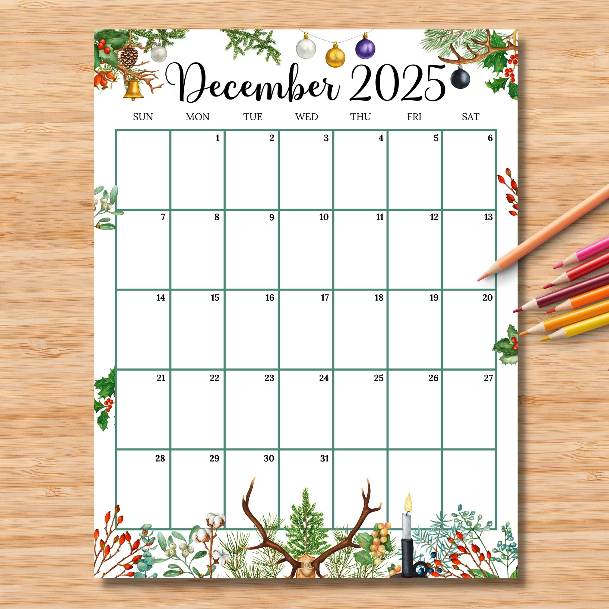 EDITABLE December 2025 Calendar vertical portrait Colorful