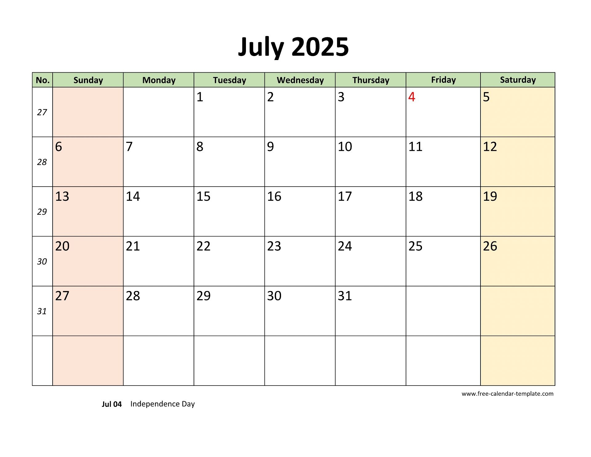 July 2025 Calendar Printable With Coloring On Weekend horizontal Free Calendar template