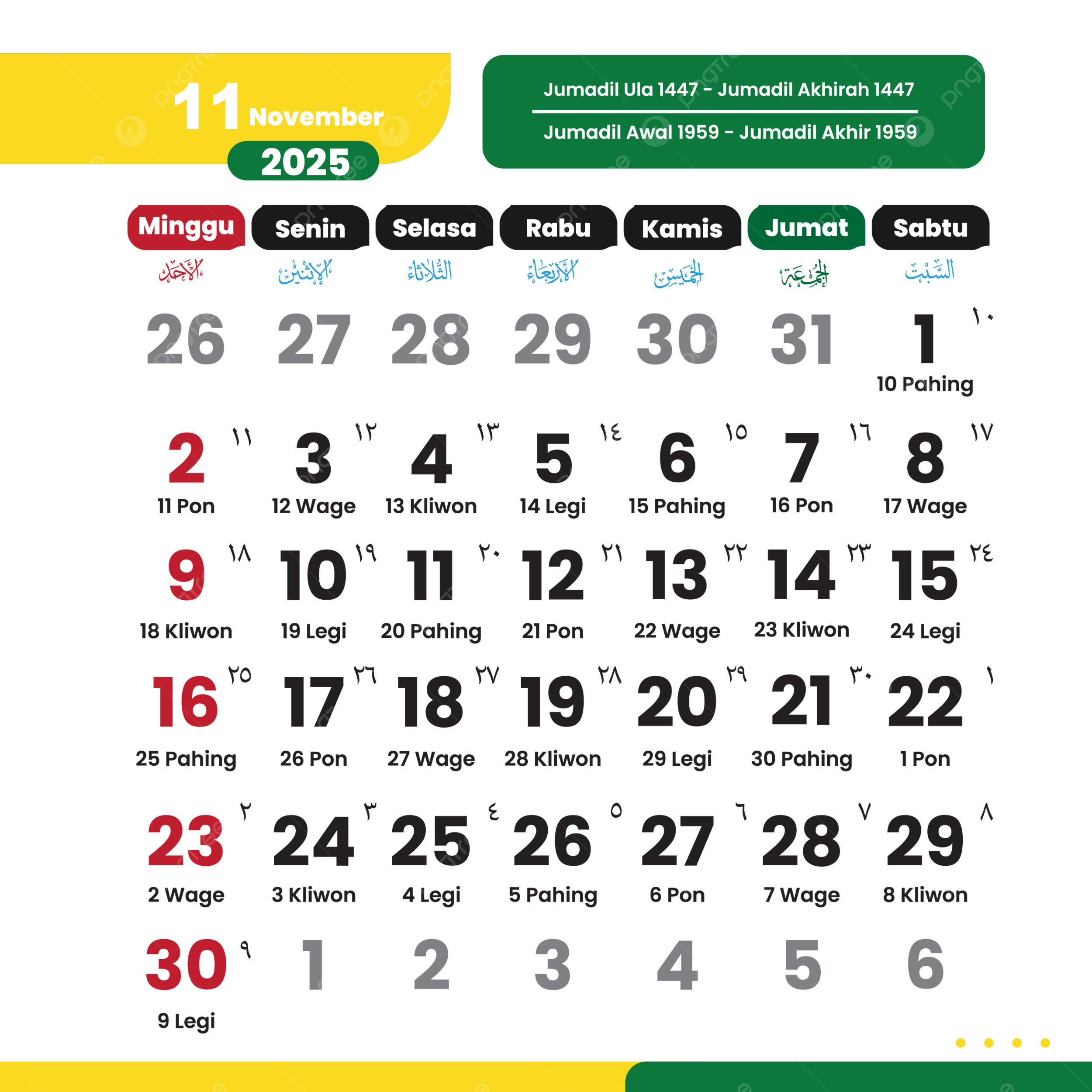 Simple Printable Calendar 2025 Month November Clipart Yellow Green