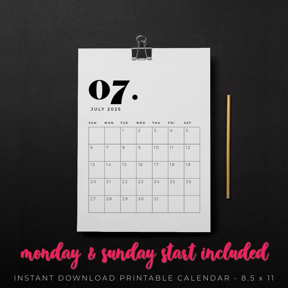 Our July 2025 calendar in black and white features spacious date boxes for you to jot down all your plans and reminders. The minimalist color scheme allows for easy coordination with any room decor, making it a versatile addition to your home or office.