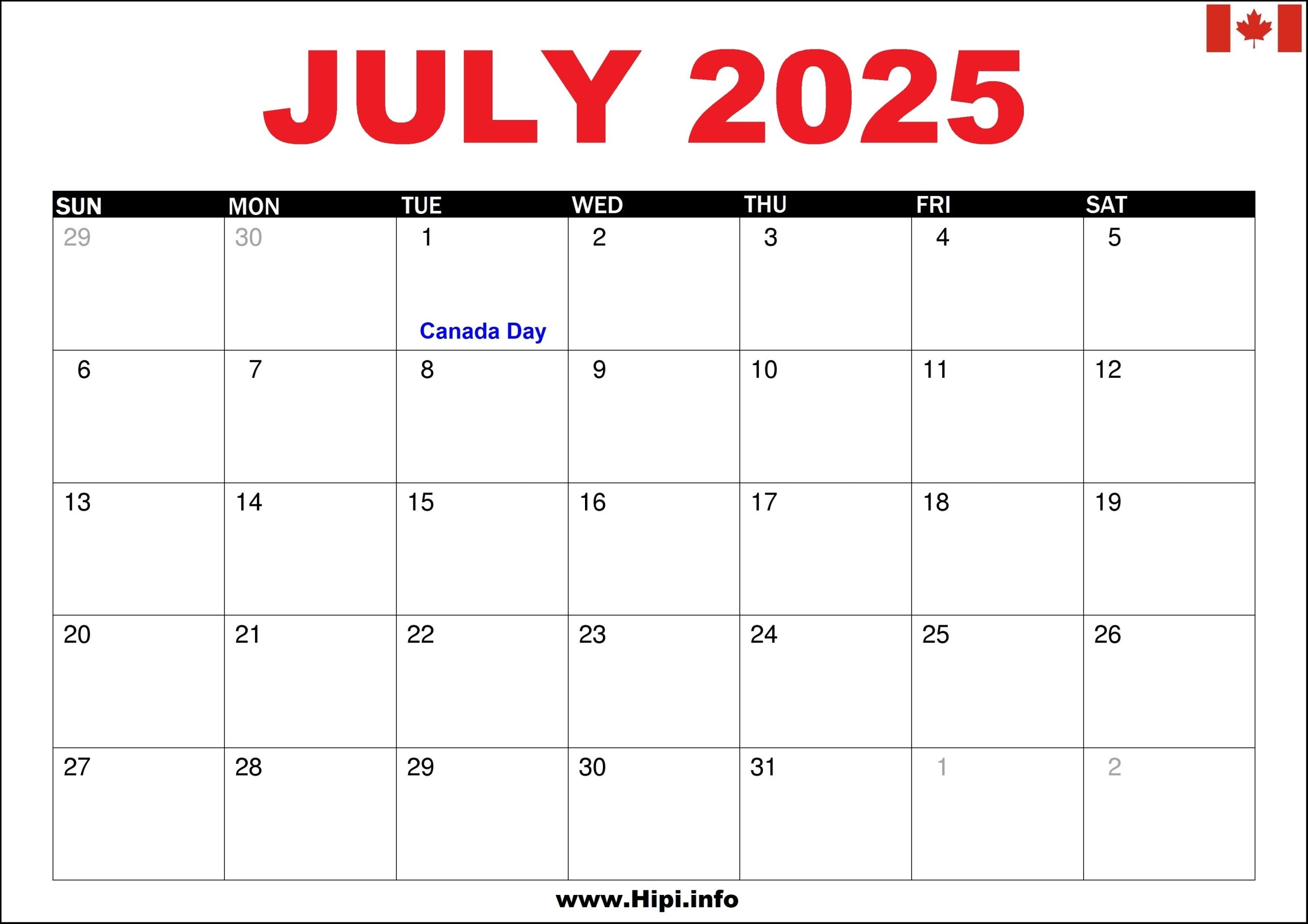 July 2025 Calendar Canada Printable