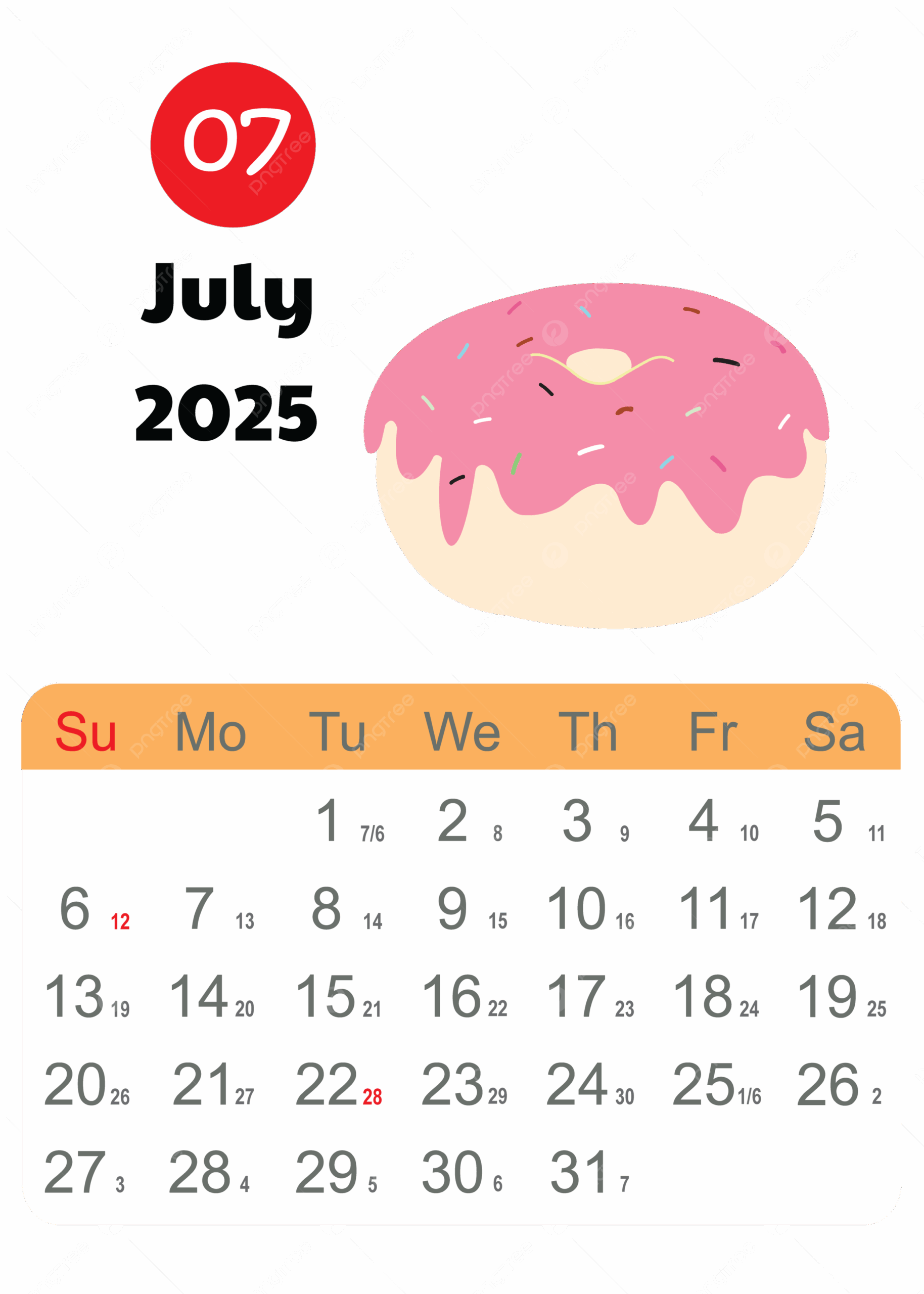 July Calendar 2025 Monthly Cute Design Vector Transperent With Donut July 2025 July Calendar 2025 July 2025 Calendar PNG And Vector With Transparent Background For Free Download