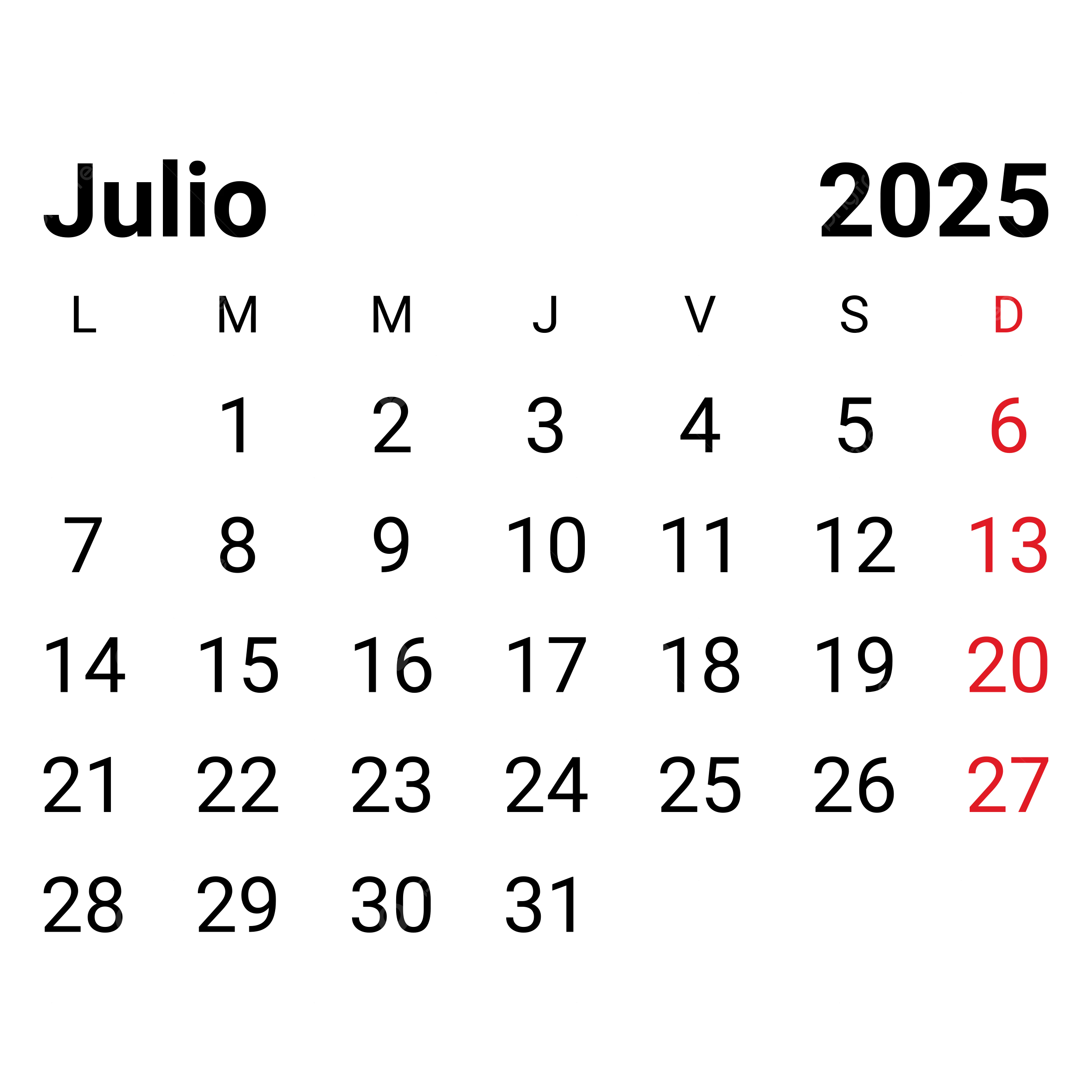 2025 July Spanish Monthly Calendar Vector 2025 July Spanish Monthly Calendar 2025 July Calendar PNG And Vector With Transparent Background For Free Download
