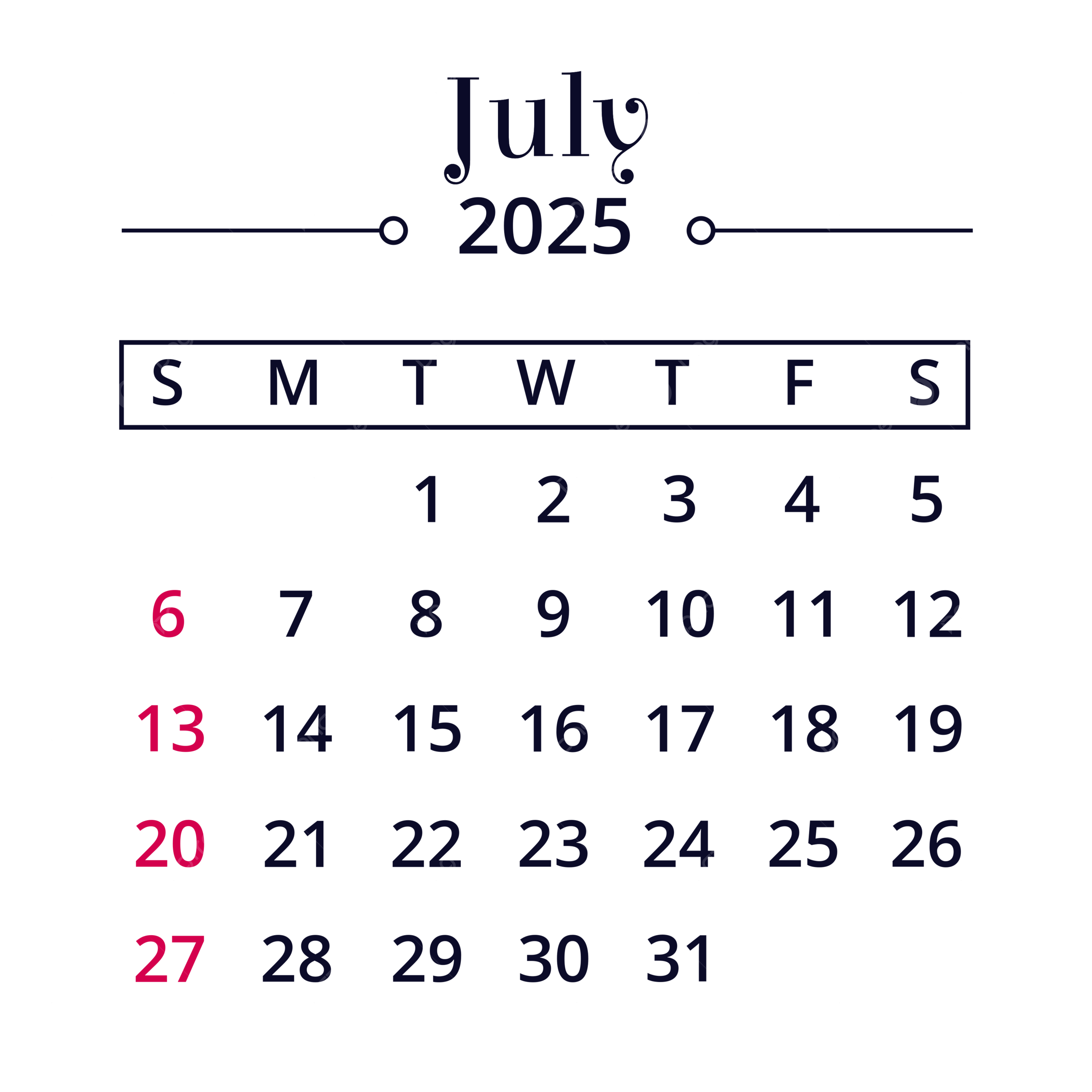 July 2025 Calendar Elegant Vector July 2025 July 2025 Calendar Calendar 2025 PNG And Vector With Transparent Background For Free Download