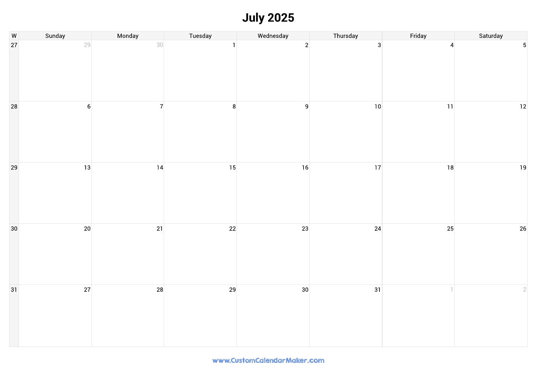 July 2025 Printable Calendar With Week Numbers Custom Calendar Maker