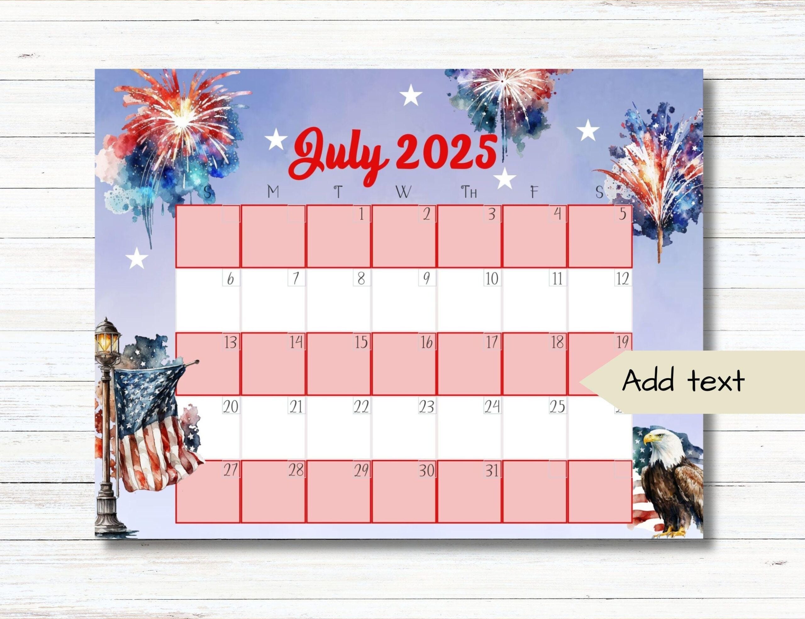 EDITABLE July 2025 Calendar 2025 July Calendar Printable Monthly Calendar Wall Calendar Digital Calendar 2025 Calendar July 2025 Etsy
