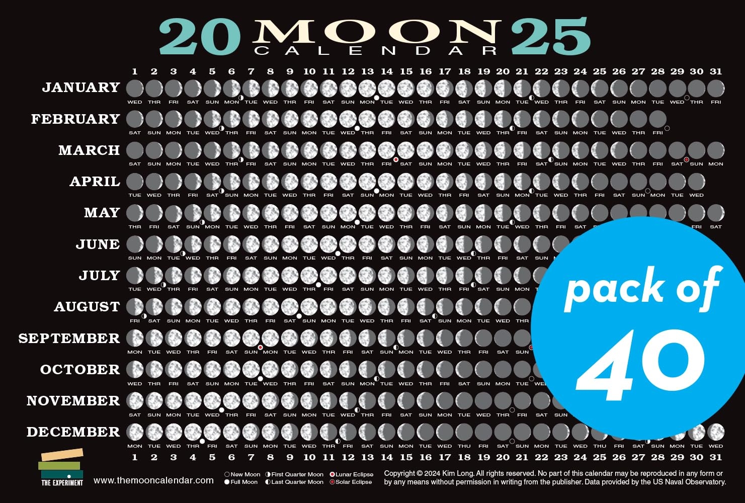 2025 Moon Calendar Card 40 Pack Lunar Phases Eclipses And