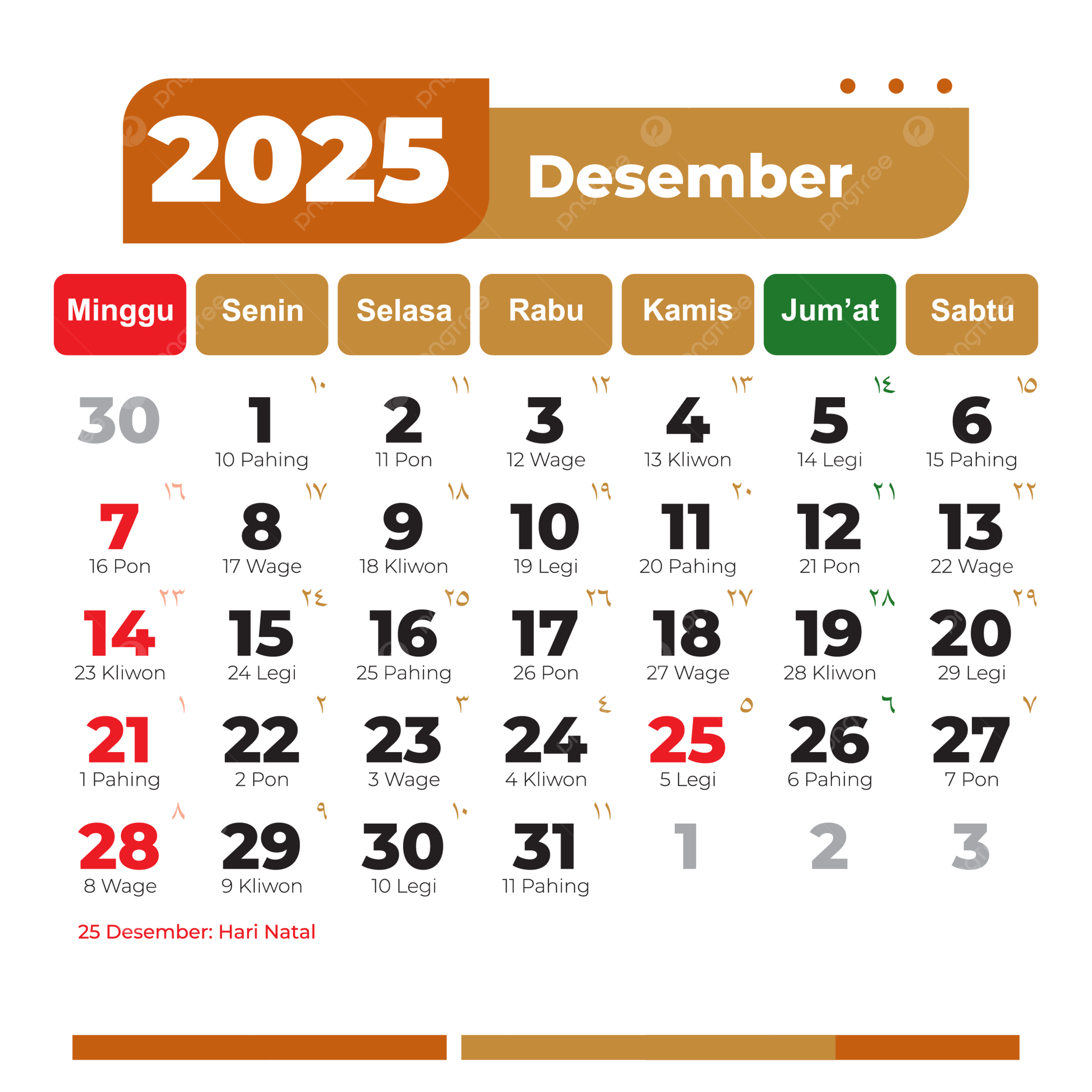December 2025 Calendar Complete Vector Hijri And Gregorian National Holidays Light Brown Color 2025 Calendar PNG And Vector With Transparent Background For Free Download