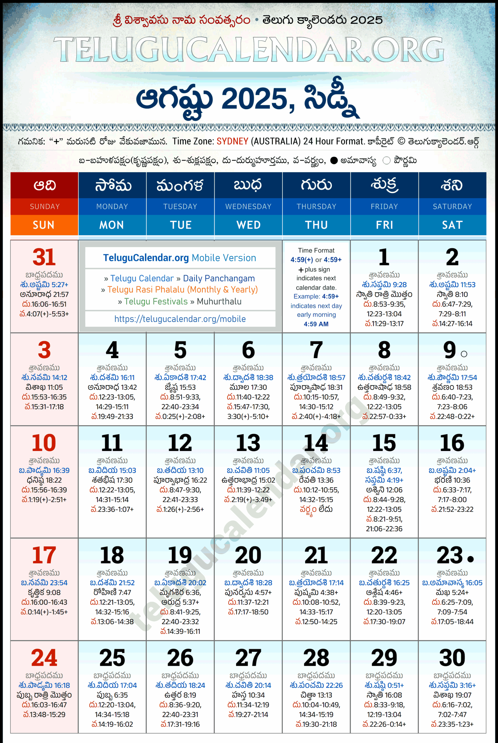 Sydney Telugu Calendar 2025 August PDF Festivals