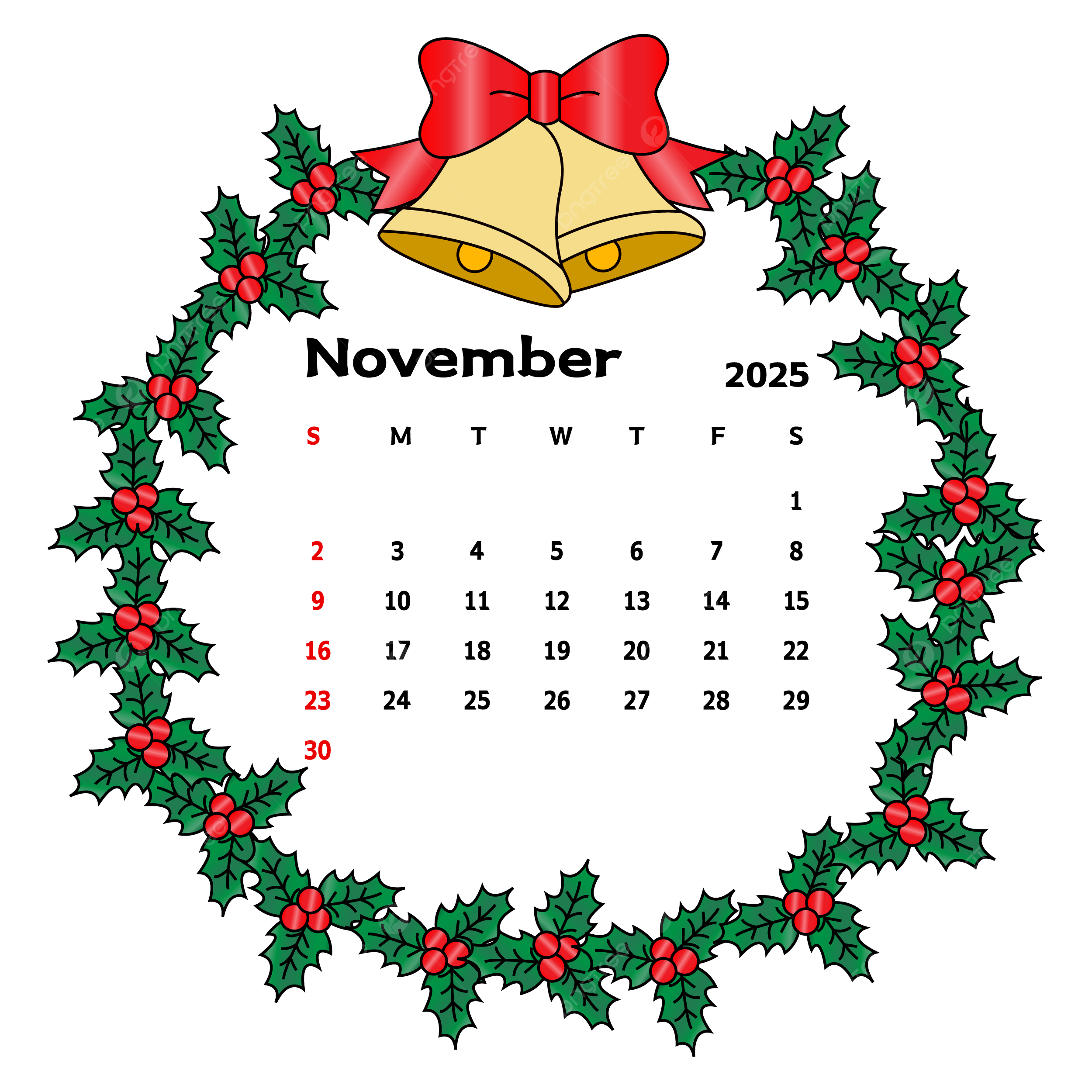 November 2025 Calendar With Leafy Circle Frame And Bells Vector Calendar November 2025 Leaf PNG And Vector With Transparent Background For Free Download