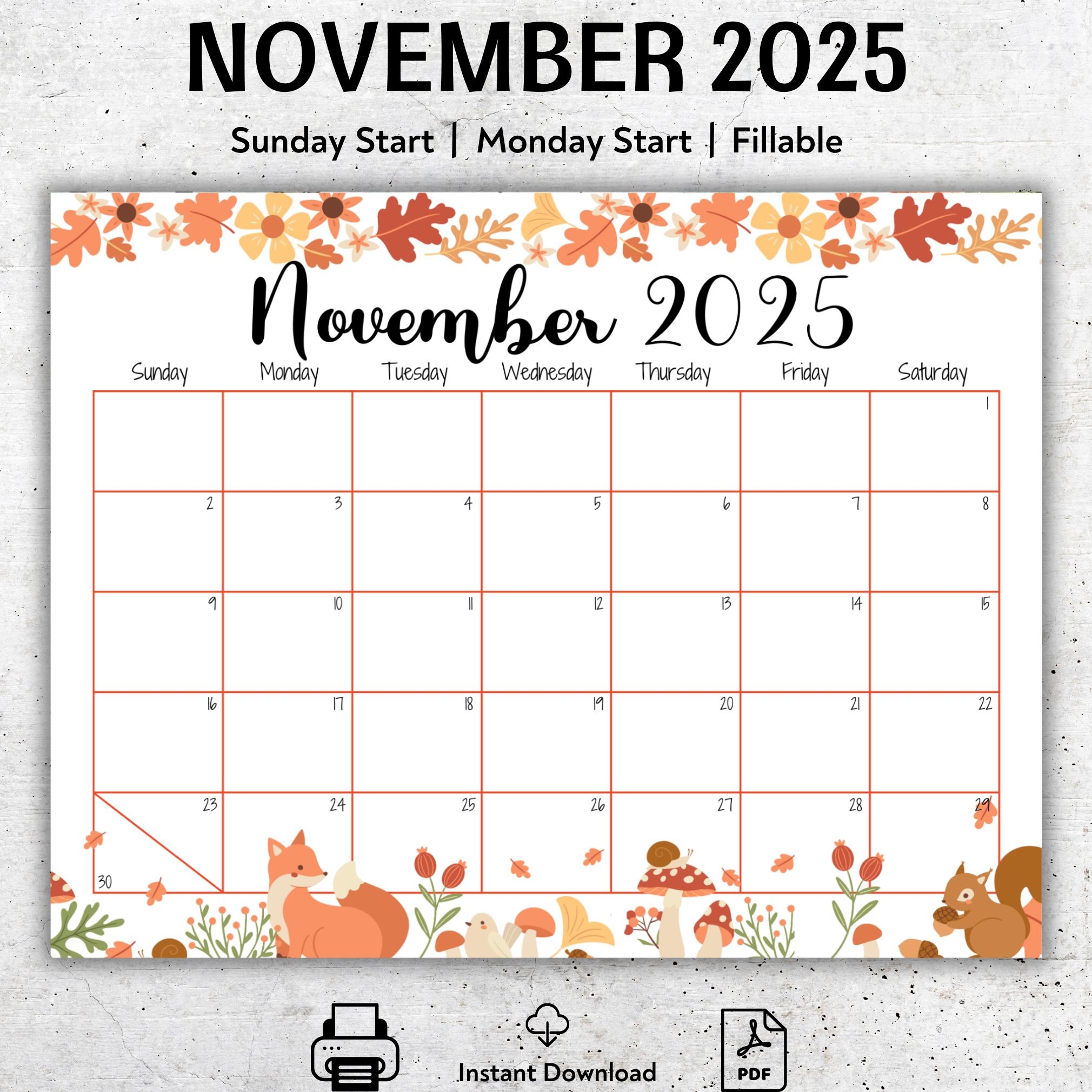 Editable November 2025 Printable Calendar autumn Monthly Planner classroom family Calendar Fillable us Letter Instant Download Start sunday Etsy