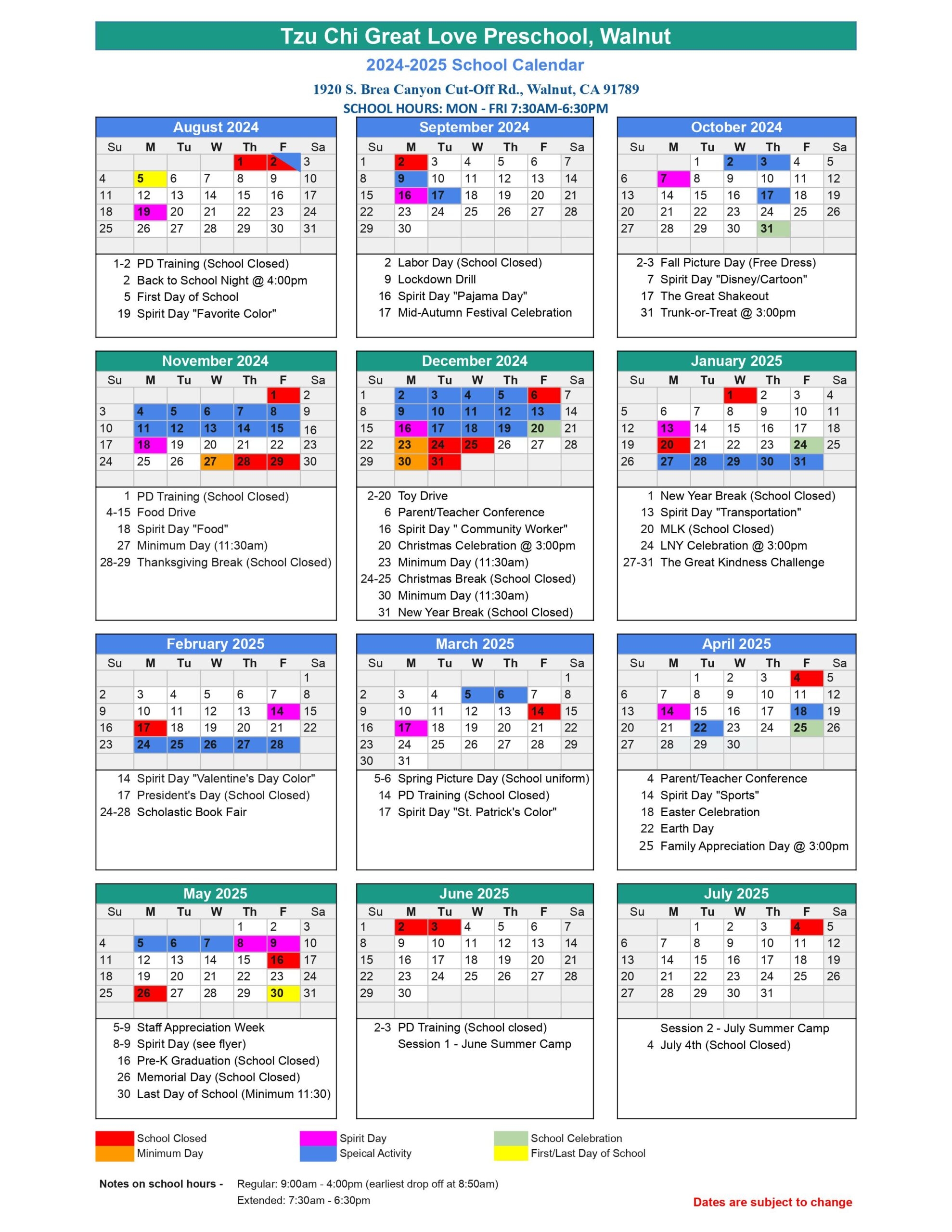 School Year Calendar Tzu Chi Education